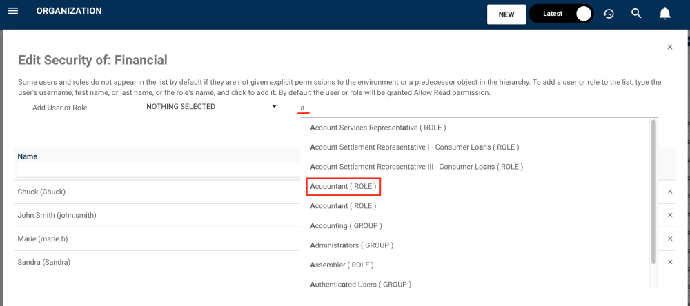 4. Here, we chose a role. Type the name of the Role you want to set a security permission for the EPC object. From the search suggestions, click to select the Role you want to assign