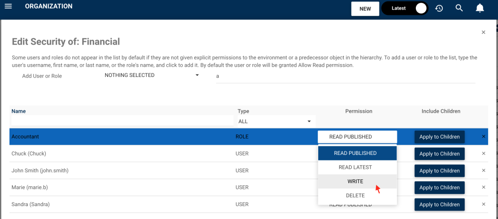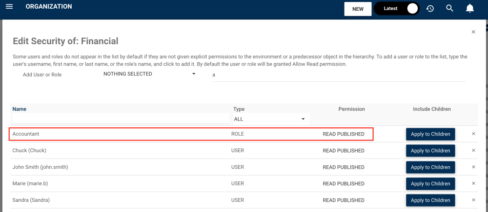 5. The Role will appear on the table under, where the security level can be assigned. By default, the user or role will be granted Read Published permission.