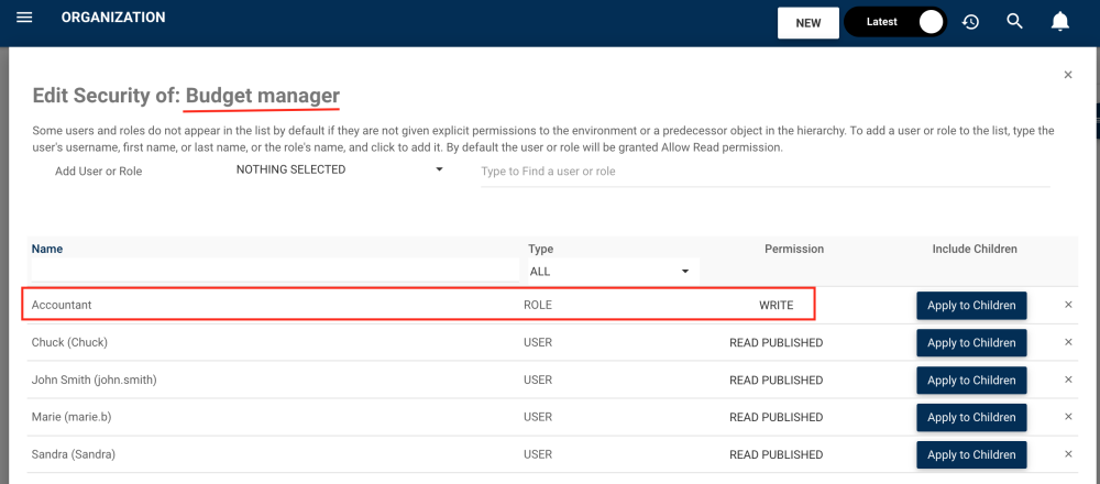 9. The permission will be applied to all children. Here’s an example of a Role within the Financial Org. Unit.