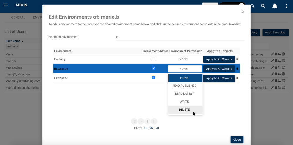 On the other hand, if your security needs are simpler, it is possible to set these permissions at the environment level. This way, you can grant permissions at once, for all objects in the environment by clicking on the “Apply to all objects” box.