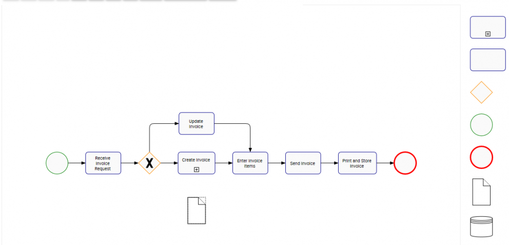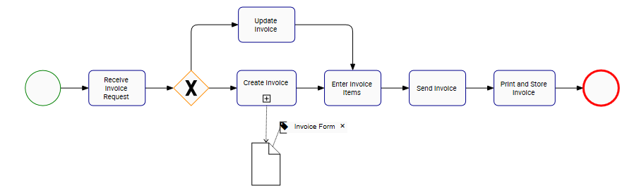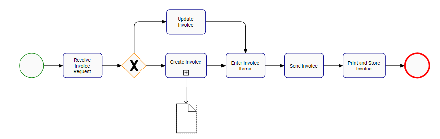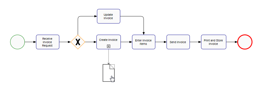 - Connect the Artifact to a shape in the process map. In this example, add a flow from the sub-process “Create an Invoice” to the artifact