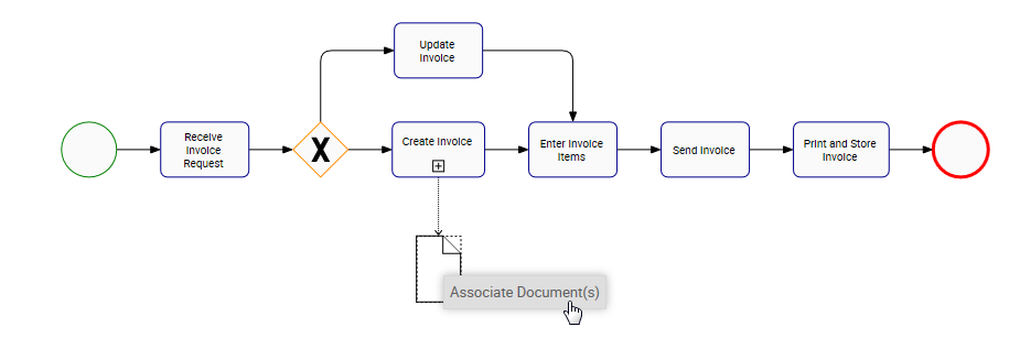 For this reason, Web Modelers can add the shape of an Artifact and associate Documents to the shape to display how a document is affected and/or used during the execution of a process map.