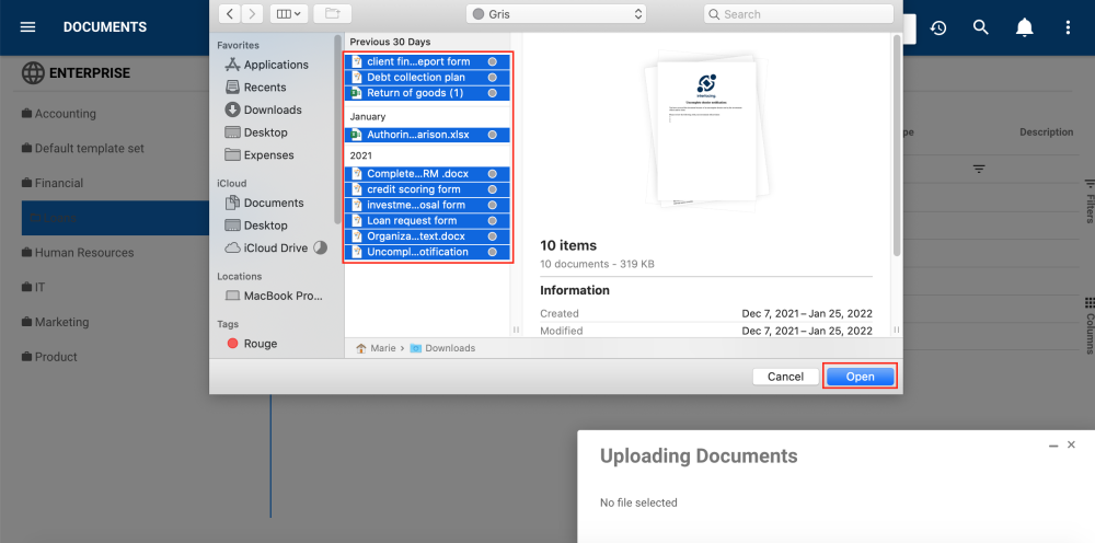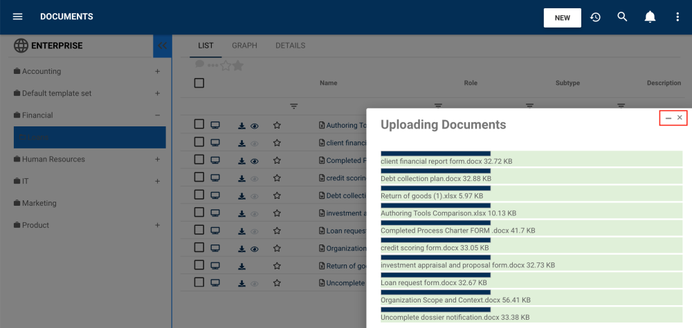 Uploading and creating new documents is faster with the mass document upload feature. By only clicking one button, users can upload several documents at once.