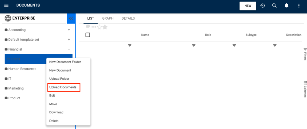 1. Navigate to the desired document folder. Right click on the folder and select “Upload Documents” to upload multiple documents. The “Upload folder” option is explained here.