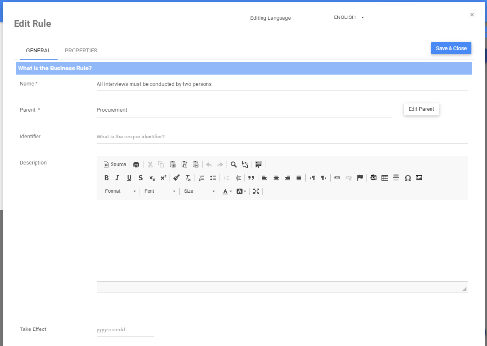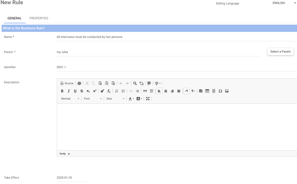 | Description | This field describes the Business Rule in detail. The rich text format allows for text formatting, images, URLs, tables, etc. |