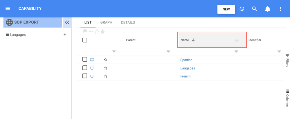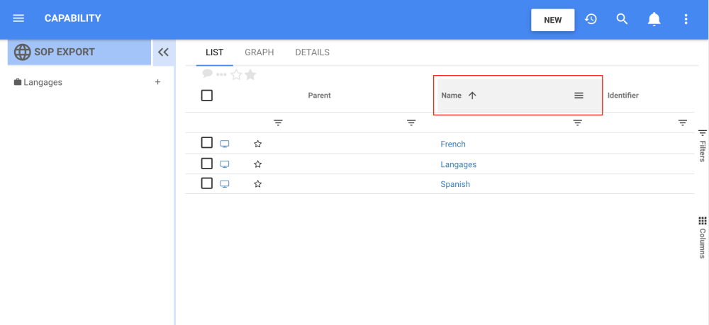 Sorting allows users to classify capabilities based on selected criteria. You can sort list results for any column title that is written in BLUE.