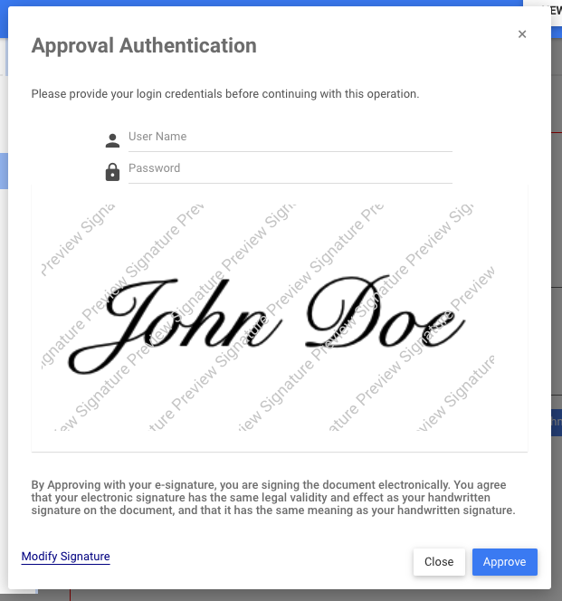 6. If the sender submitted the approval with the required signature, the approver will see an authentication window. Otherwise, the objects will be approved without signature authentication.
