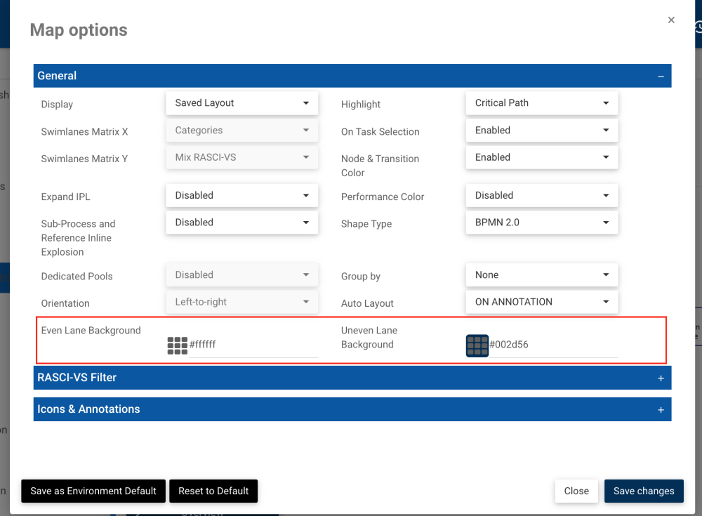 It is now possible to remove or apply your own custom background color of your swimlane map according to your organization’s aesthetics or needs. This feature can be accessed from the Map Options menu.
