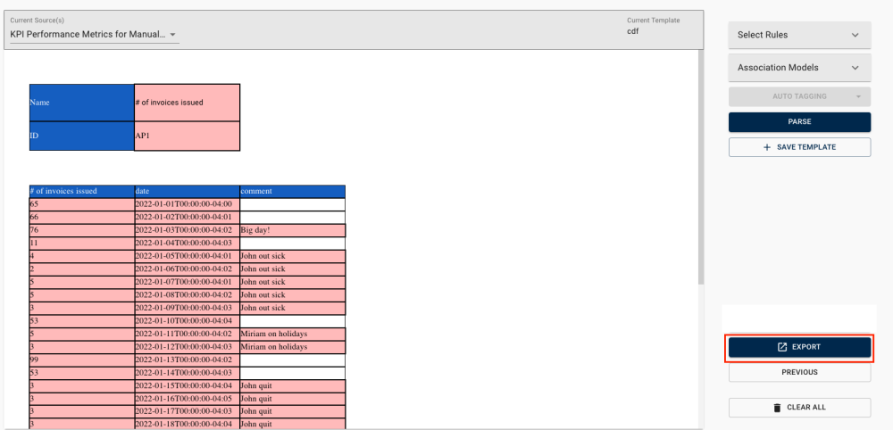 To Export the data to EPC, users can click on the Export button. The action is available after the first tag of the document :