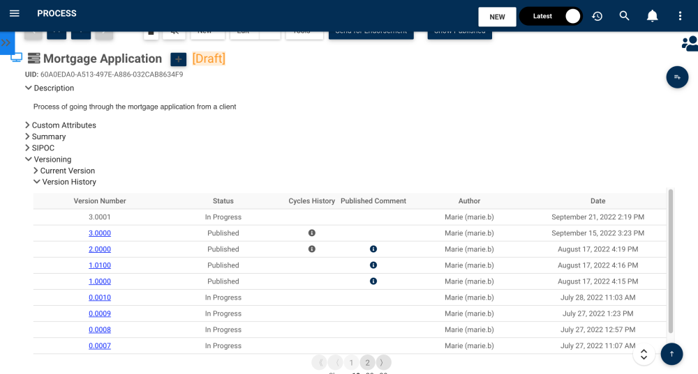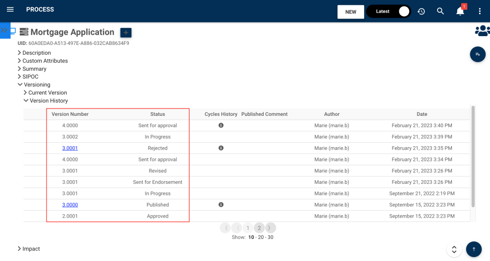 The versioning section of the object now displays data about important actions performed on the object directly without having to run the audit report (such as last editor time/date and rejected endorsement & approval history). Upon upgrade this information will be visible for all historical versions as well since all data has always been available in the database.