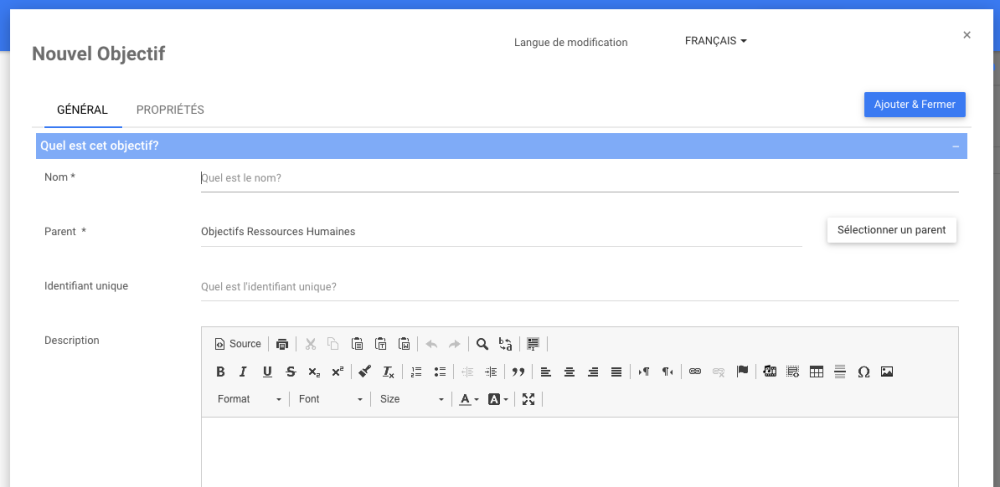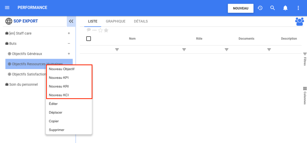 Dans notre exemple, nous pouvons sélectionner des objets : objectif, KPI, KRI et KCI. Cela varie en fonction du module et de l’objet qui a été sélectionné.