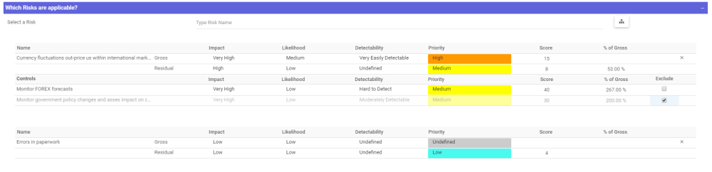 Dans les cas où les contrôles peuvent ou non s’appliquer à un risque sur un processus spécifique, les utilisateurs peuvent cocher la case Exclure. Cela désactivera le contrôle et le supprimera du score de risque résiduel global.