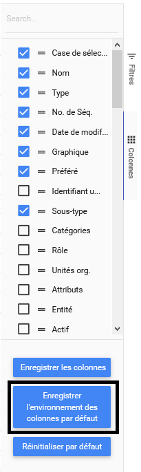 | Seul un administrateur d’environnement ou de niveau système peut voir le bouton “Save Columns as Environment Default” |