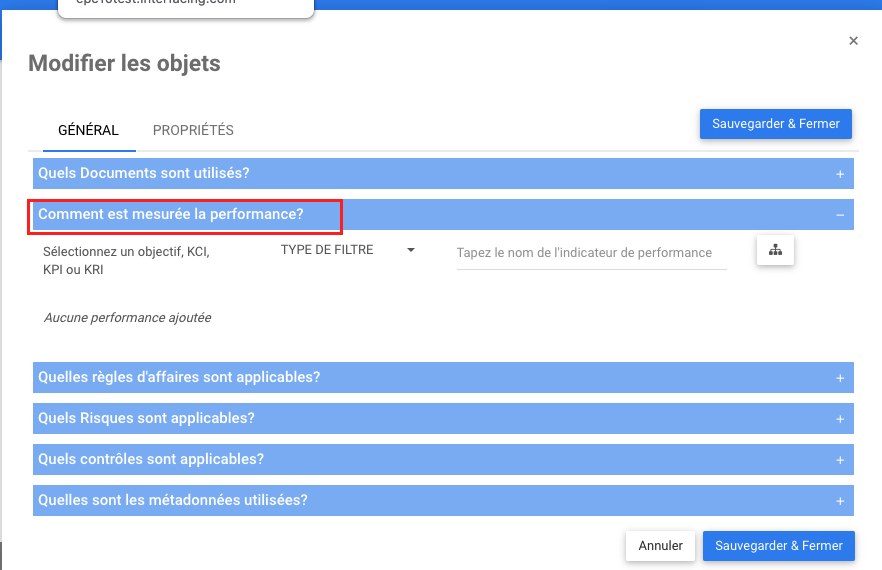 6.Sélectionnez un objectif, un KCI, un KPI ou un KRI et cliquez sur le bouton Enregistrer et fermer.