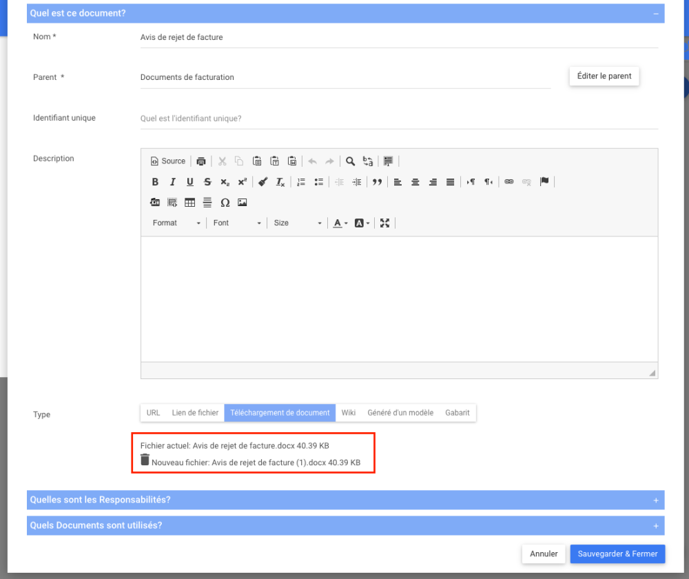 Pour télécharger le document, les utilisateurs accèdent à la page DÉTAILS du document et cliquent sur Éditer. Le formulaire d’Édition de document s’ouvre, dans la première section, les utilisateurs peuvent choisir ou faire glisser le nouveau document.