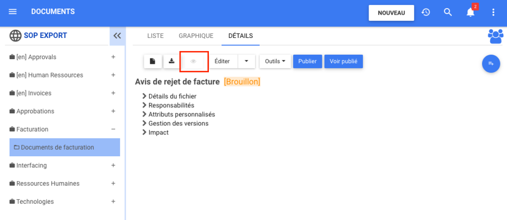 Une fois que le document est prêt pour la publication, l’utilisateur peut le publier et la comparaison de documents arrête d’afficher les modifications car il est déclaré comme document officiel.