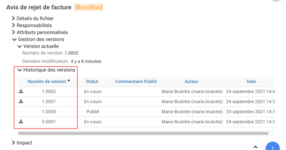Par exemple : ci-dessous, nous pouvons voir la version 1 du document. Si les utilisateurs souhaitent apporter des modifications, ils doivent télécharger le document pour le modifier.