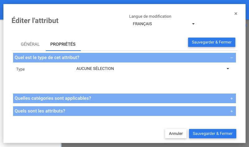 L’onglet Propriétés contient des sections pour le type, les catégories applicables et les attributs.