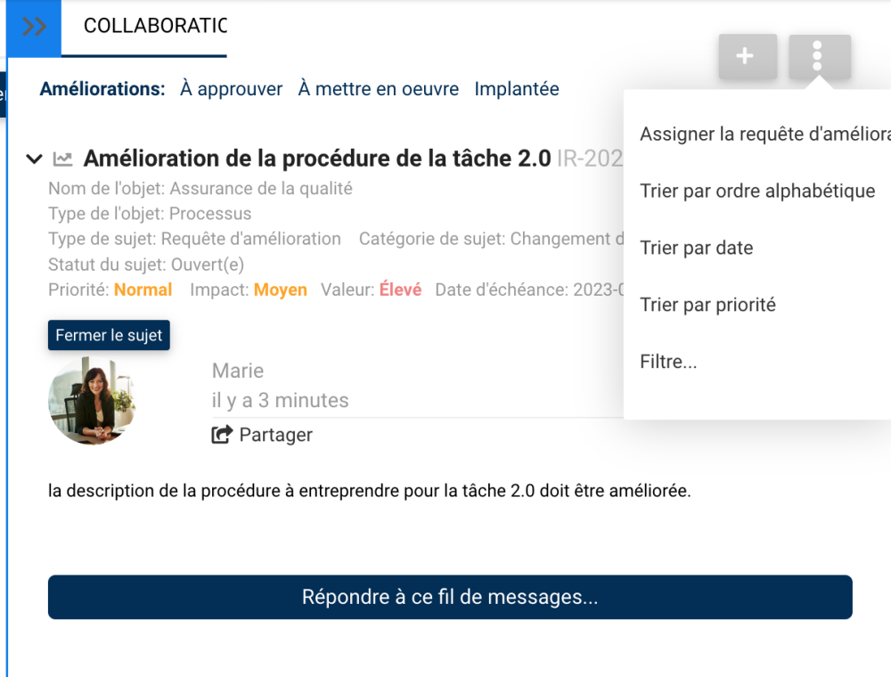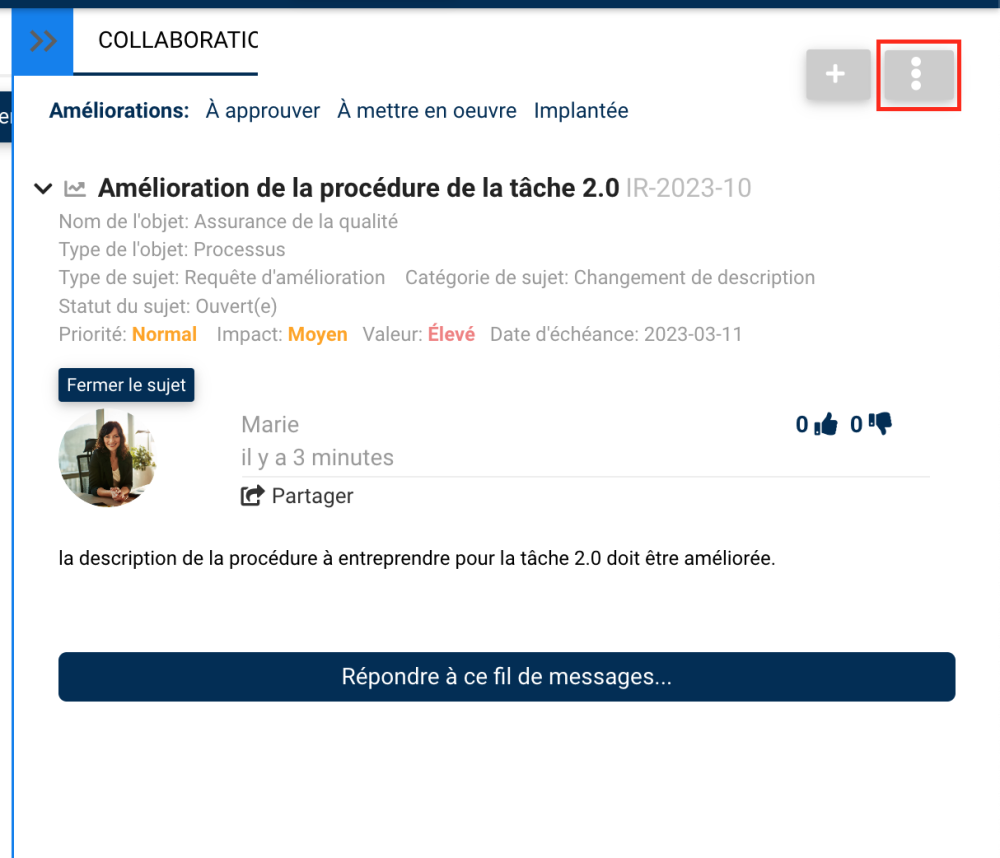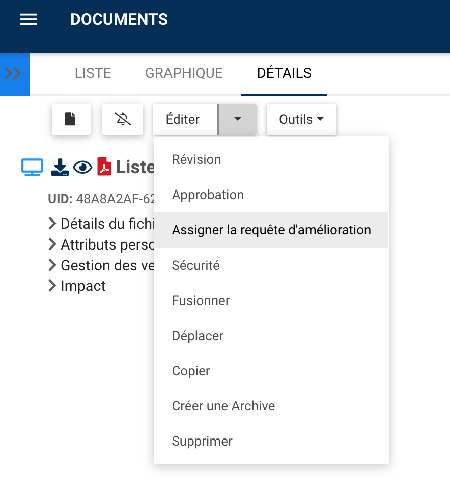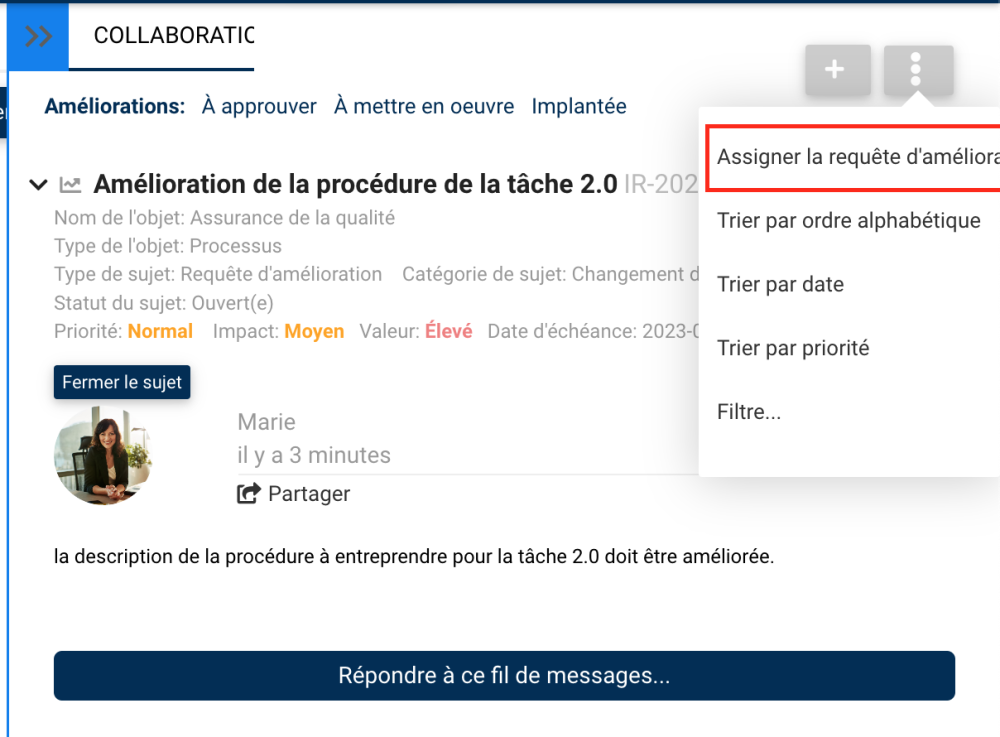 2. Cliquez sur le bouton fléché pour ouvrir le menu d’édition et sélectionnez “Assigner la requête d’amélioration”