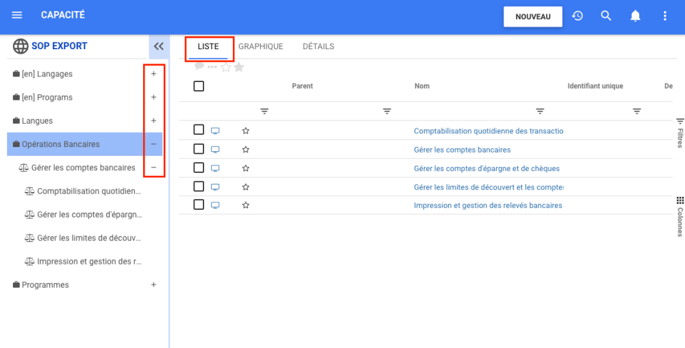 3. Sur le côté gauche, les utilisateurs peuvent voir l’arborescence des capacités, avec les ensembles. Pour afficher les capacités à l’intérieur des ensembles, les utilisateurs peuvent développer les ensembles en cliquant sur le signe +. Sur le côté droit, par défaut, la vue de liste du module de capacité est accessible.