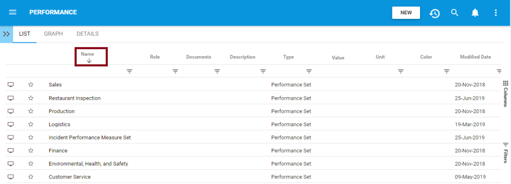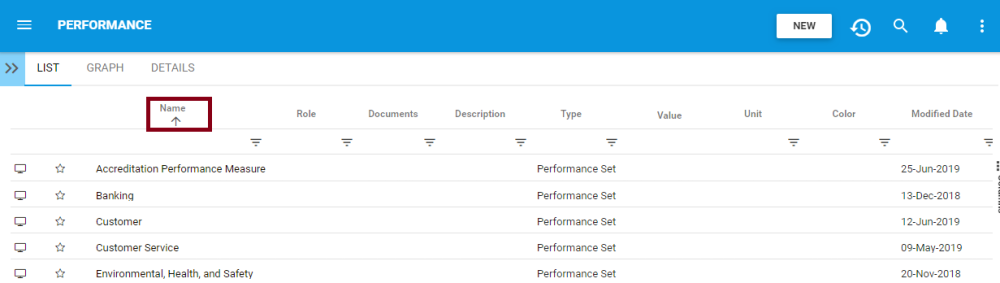| Type | Permet aux utilisateurs de trier les mesures de performance par leur type spécifique. Permet aux utilisateurs de trier les mesures de performance par un nombre ou un mot clé dans les noms de mesures de performance |