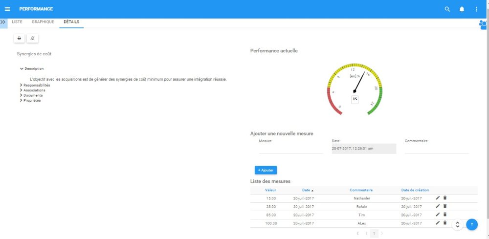 Les utilisateurs peuvent entrer des données de mesure de performance. Cela fournit aux utilisateurs une sortie pour signaler les paramètres clés qui, à leur tour, peuvent être surveillés et suivis dans le cadre d’EPC. Le fait de transférer des mesures de performance au sein d’EPC permet aux gestionnaires de surveiller les informations spécifiques au rendement qui peuvent être corroborées avec d’autres sources.
