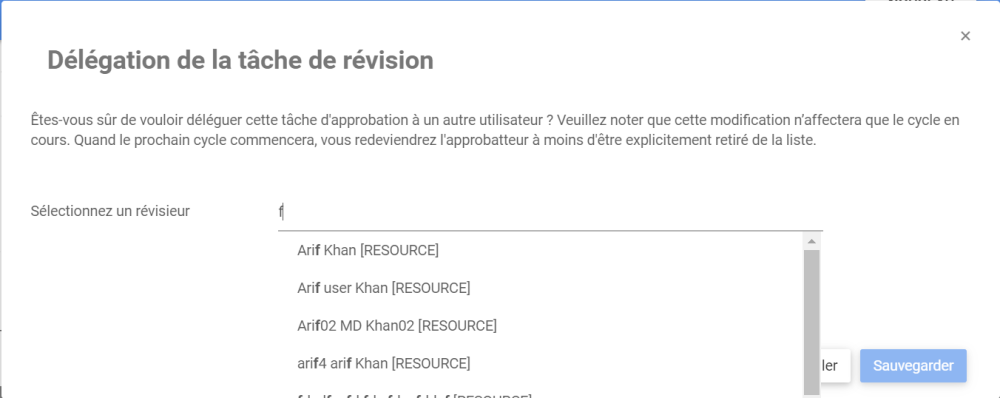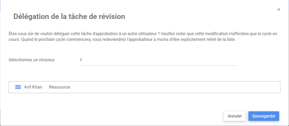 La fonction de délégué dans le cycle de révision permet à l’utilisateur de réaffecter sa tâche pour le cycle en cours. En utilisant la fonctionnalité “Déléguer”, l’endosseur peut choisir une autre ressource pour déléguer sa tâche pour ce cycle.