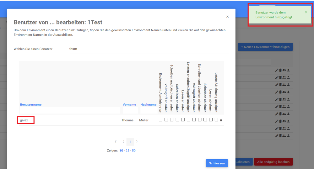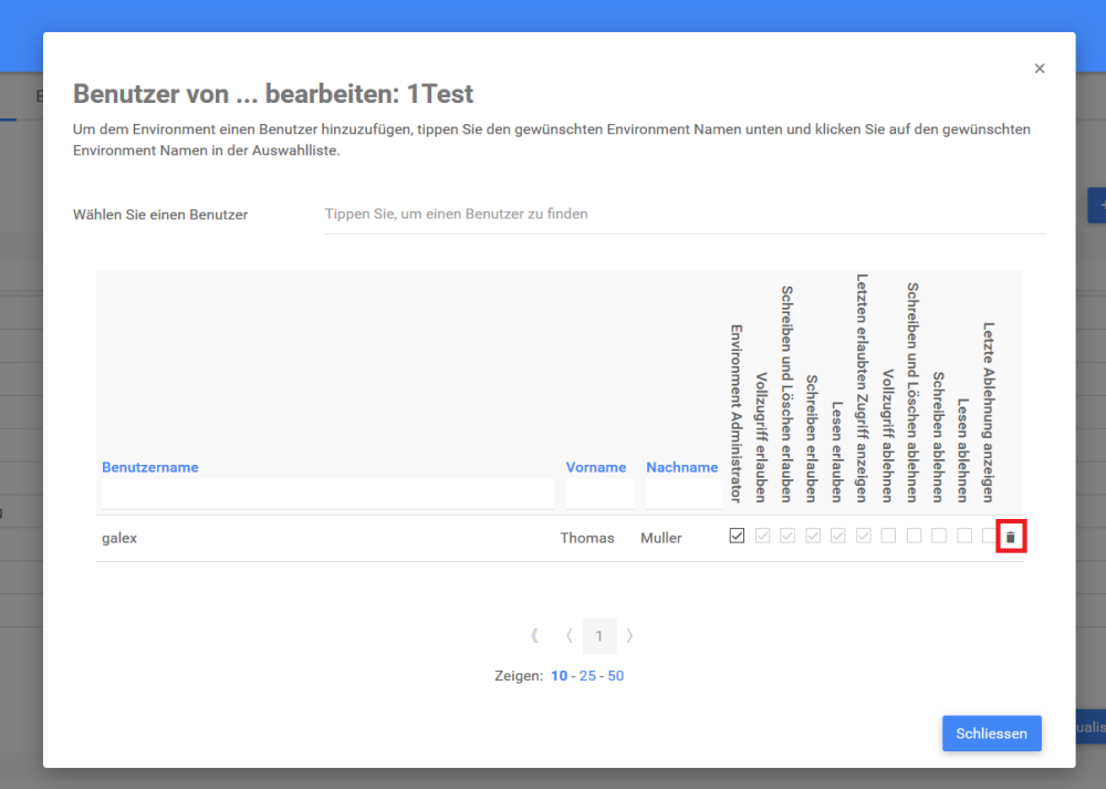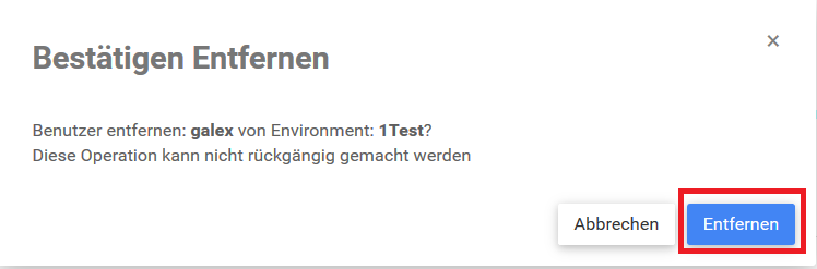 3. Das folgende Fenster erscheint, wählen Sie das Feld “Entfernen”, um einen Benutzer aus einer Umgebung zu entfernen.
