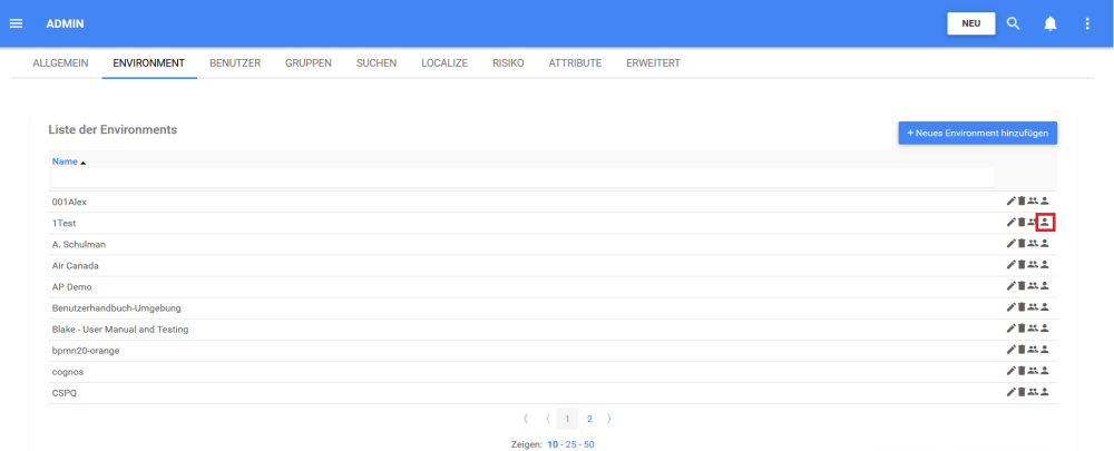 Auf der Registerkarte Umgebung können Systemadministratoren den Umgebungen Benutzer hinzufügen. Sobald der Benutzer hinzugefügt wurde, kann er alle in einer Umgebung verfügbaren Informationen einsehen.