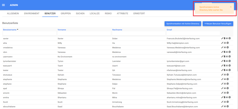 - Der Systemadministrator erhält zunächst eine rote Benachrichtigung, dass die Synchronisation in Bearbeitung ist.