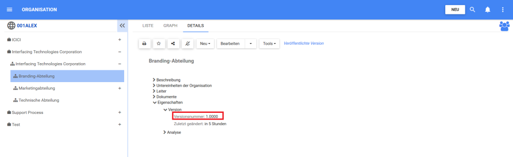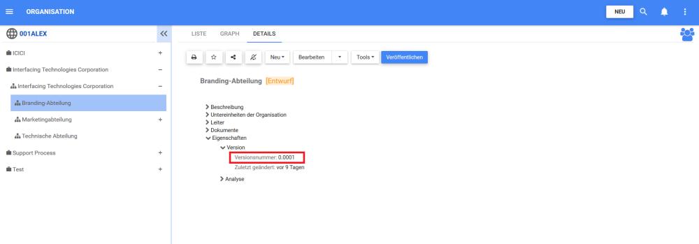 - Wenn das Objekt ein Entwurf ist, hat die Versionsnummer einen dezimalen Zahlenwert. Der Dezimalwert erhöht sich, wenn neue Entwurfsversionen erstellt werden.