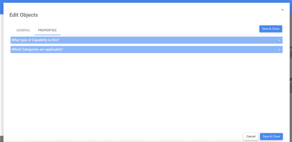 The Mass edit-Capability feature will allow the user to select the general and properties that are applicable to one or more objects through a single interaction.