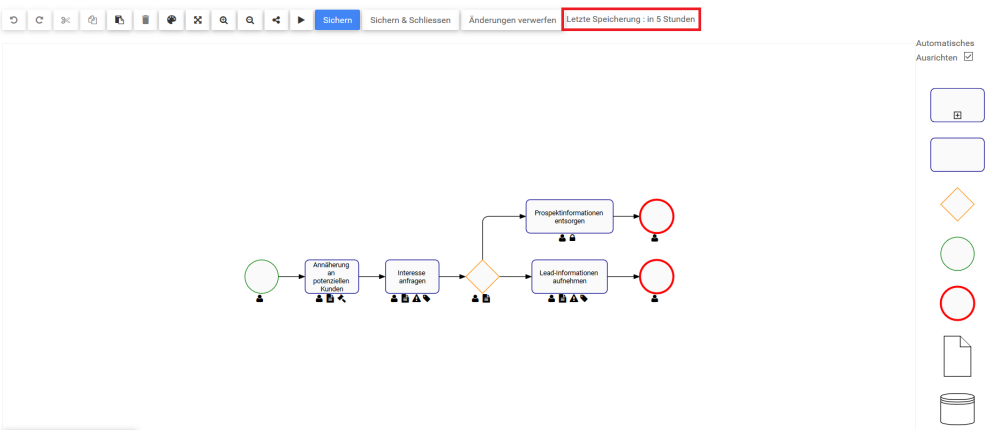 Da Sie während einer Bearbeitungssitzung mehrfach speichern können, dient das Letzte Speichern dazu, anzuzeigen, wann die neueste Version dieses Objekts gespeichert wurde.
