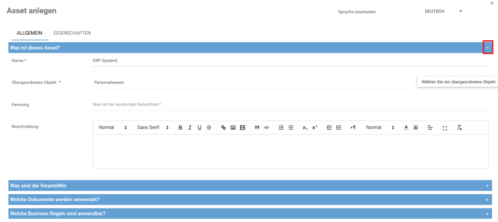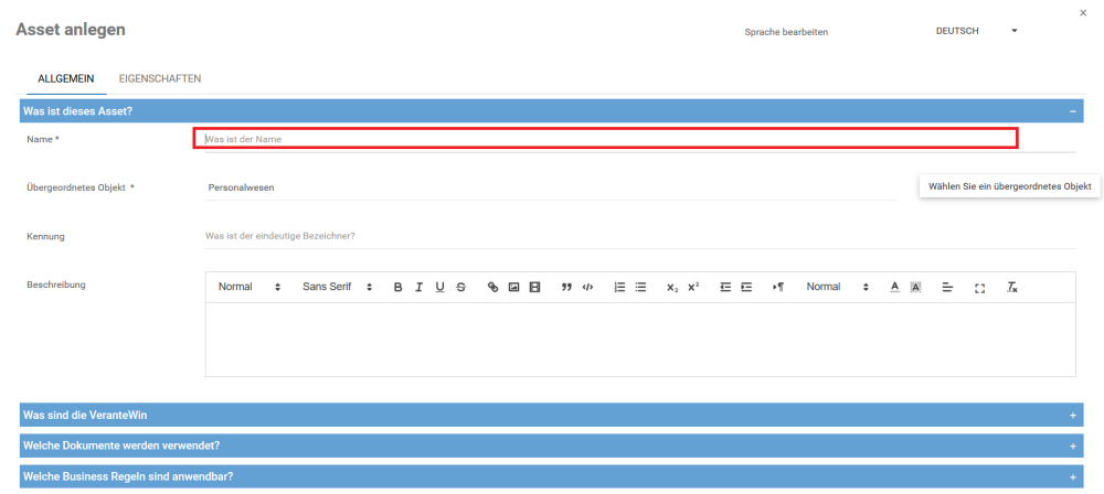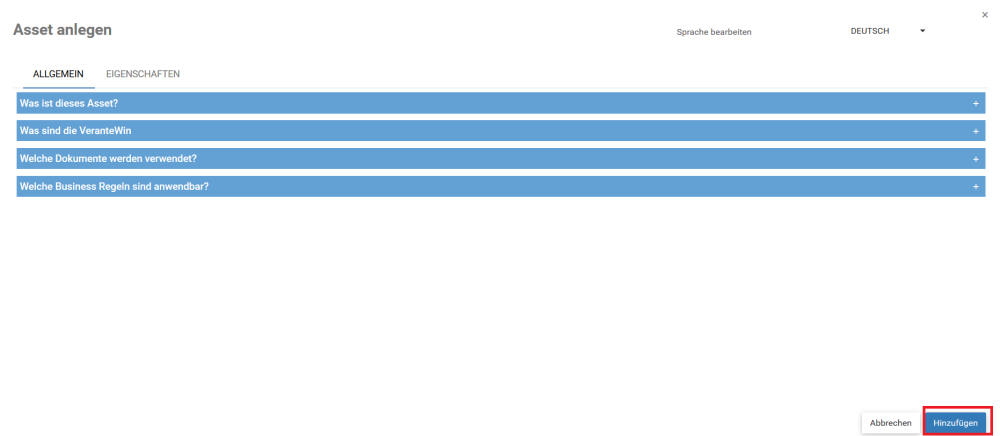 , um die verschiedenen Abschnitte auf den einzelnen Registerkarten des Fensters Neue Assets ein- und auszublenden. Geben Sie in jedem Abschnitt die richtigen Informationen über die Anlage ein.