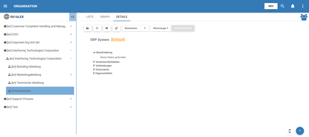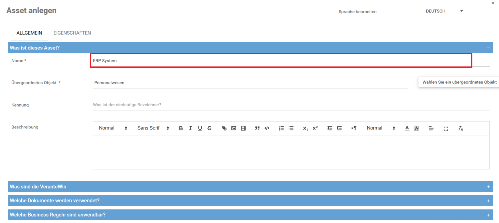 Für dieses Beispiel lautet der Name der Anlage “ERP-System”.