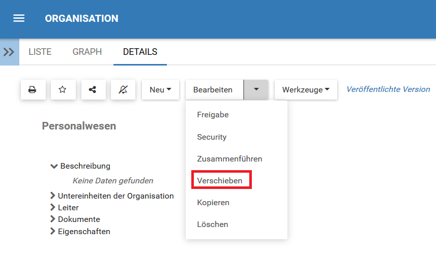 Um Organisationsobjekte zu verschieben, navigieren Sie zur Detailseite des Elements. Wählen Sie in der Dropdown-Liste “Bearbeiten” die Option “Verschieben”.