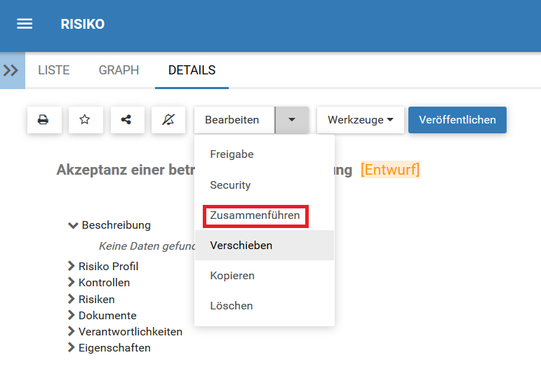 Benutzer finden diese Funktion auf der Detailseite der Elemente. Weitere Anweisungen zur Verwendung unserer *Zusammenführen*-Funktion finden Sie in der Arbeitsanweisung hier.