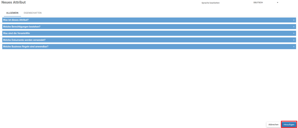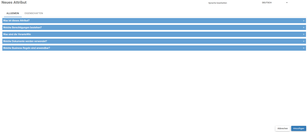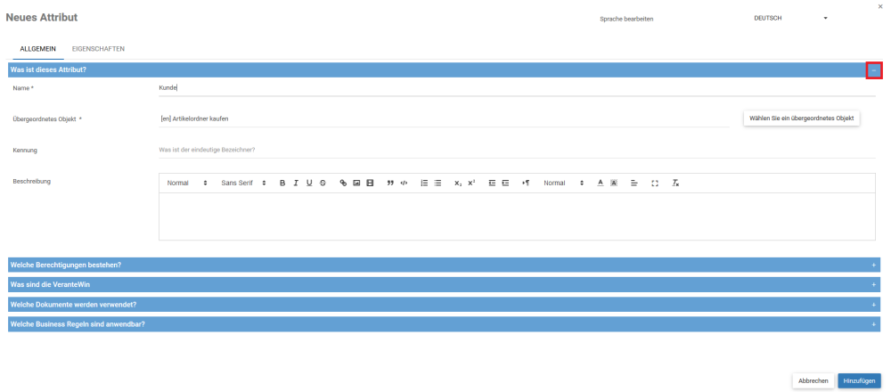 , um die verschiedenen Abschnitte in jeder Registerkarte des Fensters für neue Attribute ein- und auszublenden. Geben Sie in jedem Abschnitt die richtigen Informationen über das Attribut ein.