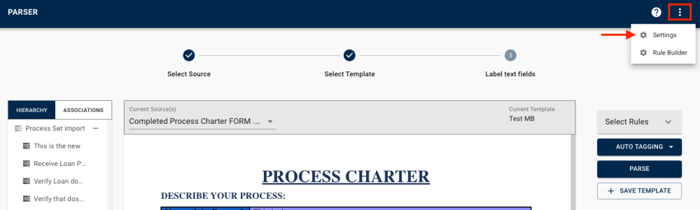To access the Parser Settings, click on the three dot icon at the top right corner of the screen. Click on the Settings option.