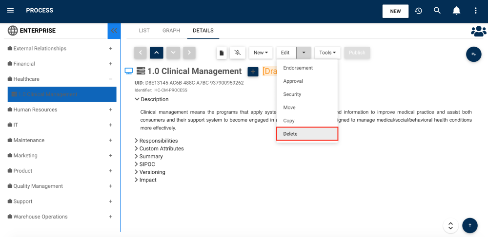 Web Modelers can delete objects on the EPC Web App. Web Modelers need to have the Delete security permission to delete objects. Once an object is deleted, all its children objects will be deleted as well. Users with the right permissions can find the delete feature button in the Edit Toolbar in the Details page of any EPC object. It is also possible to mass delete objects in the List page.