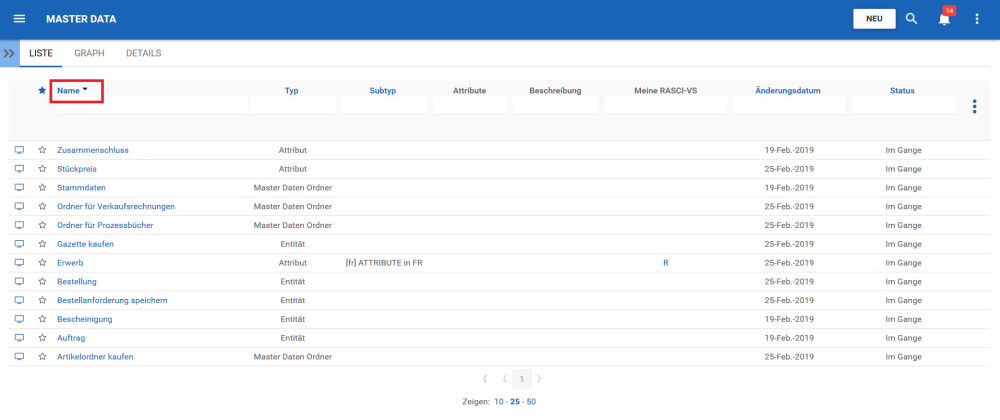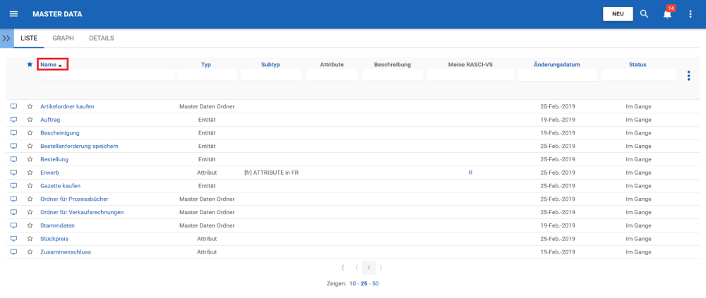 Die Sortierung ermöglicht es Benutzern, Stammdaten nach ausgewählten Kriterien zu klassifizieren. Sie können die Listenergebnisse für jeden Spaltentitel, der in BLUE geschrieben ist, sortieren.
