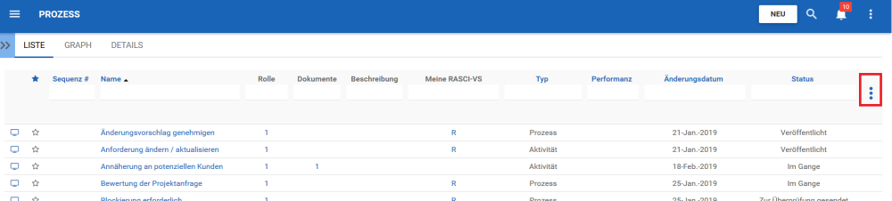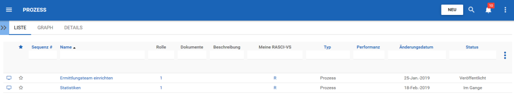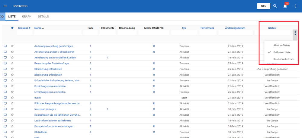 Die Listenansicht bietet eine Vielzahl von Filtering- und *Sortier*-Optionen, mit denen Benutzer die gewünschten Prozesse leicht finden können. Diese Funktionen werden verwendet, um die Elemente in der Listenansicht zu organisieren.