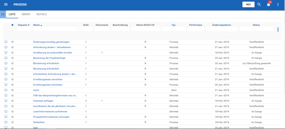Die Listenansicht ermöglicht es Ihnen, alle Prozesse zu sehen, auf die Sie Zugriff haben, einschließlich der darin enthaltenen Ablaufobjekte. Die Anzeige von Prozessen in einer Liste ermöglicht es dem Benutzer, eine schnelle Übersicht über verschiedene Prozesse und zugehörige Objekte zu erhalten, was die Navigation erleichtert.