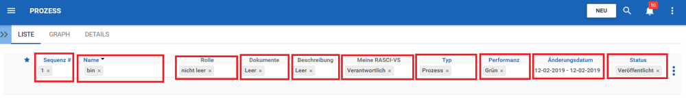 Beispiel: Die Liste wird durch eine Kombination von Filtern in jeder Spalte gefiltert.
