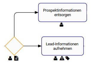 Mehrere Navigationspfade werden dargestellt, wenn ein Prozesszu- oder -abfluss mehrere verschiedene Szenarien haben kann. Dies geschieht, wenn ein Objekt mehrere Eingaben erfordert oder wenn ein Objekt mehrere Ausgaben haben kann. Die folgende Abbildung zeigt ein Szenario mit mehreren Navigationspfaden.