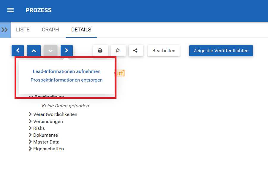 Mit den Pfeilen von Seite zu Seite können Benutzer innerhalb eines bestimmten Prozesses von Element zu Element navigieren, ohne die Detailansicht zu verlassen. Dies ermöglicht es den Benutzern, direkt auf einer Detailseite von einem Element innerhalb eines Prozesses zum nächsten zu navigieren.
