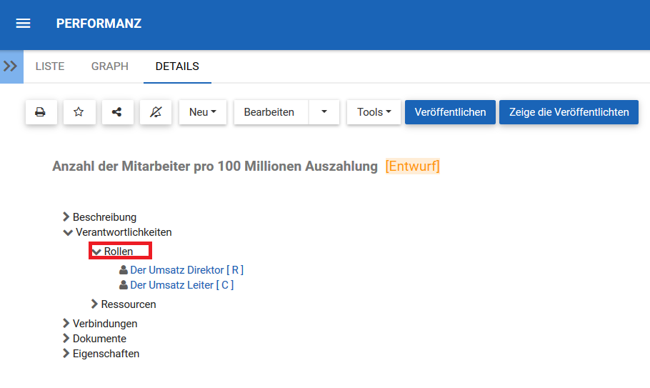 Im Abschnitt Verantwortlichkeiten werden die Rollen, Ressourcen und/oder Vermögenswerte angezeigt, die für die von Ihnen angezeigte Leistungskennzahl verantwortlich sind. Dies liefert zusätzliche Details zu jedem zugehörigen Objekt, das über die RASCI-VS-Matrix mit dem Element verknüpft wurde.