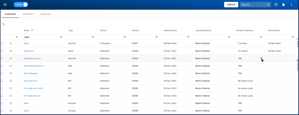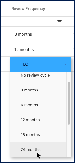 - Locate the ‘Review Frequency’ column and hover over the object. Click on the pen icon to modify the review frequency.