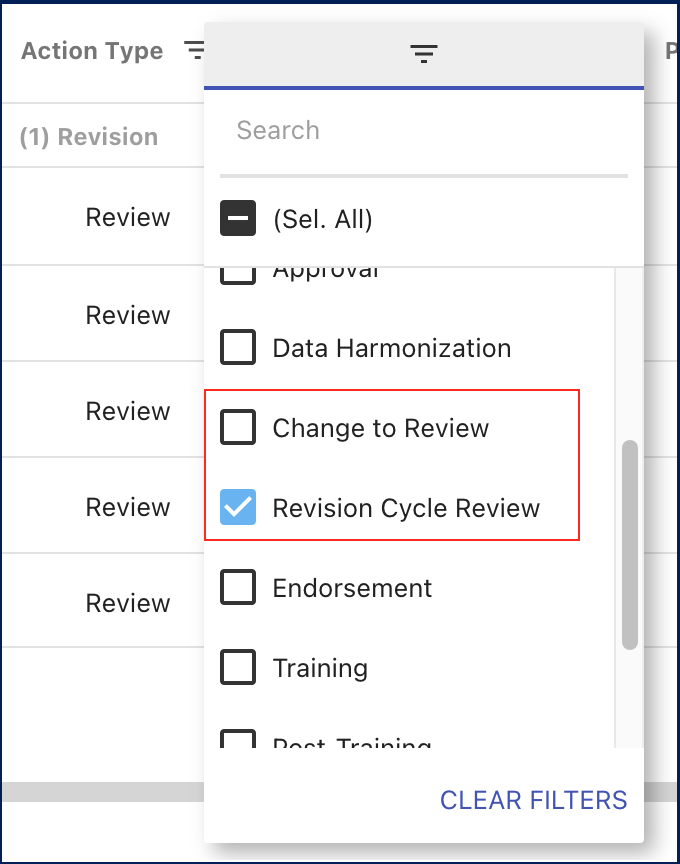 - Use the Action Type filter menu and choose “Revision Cycle Review” option.