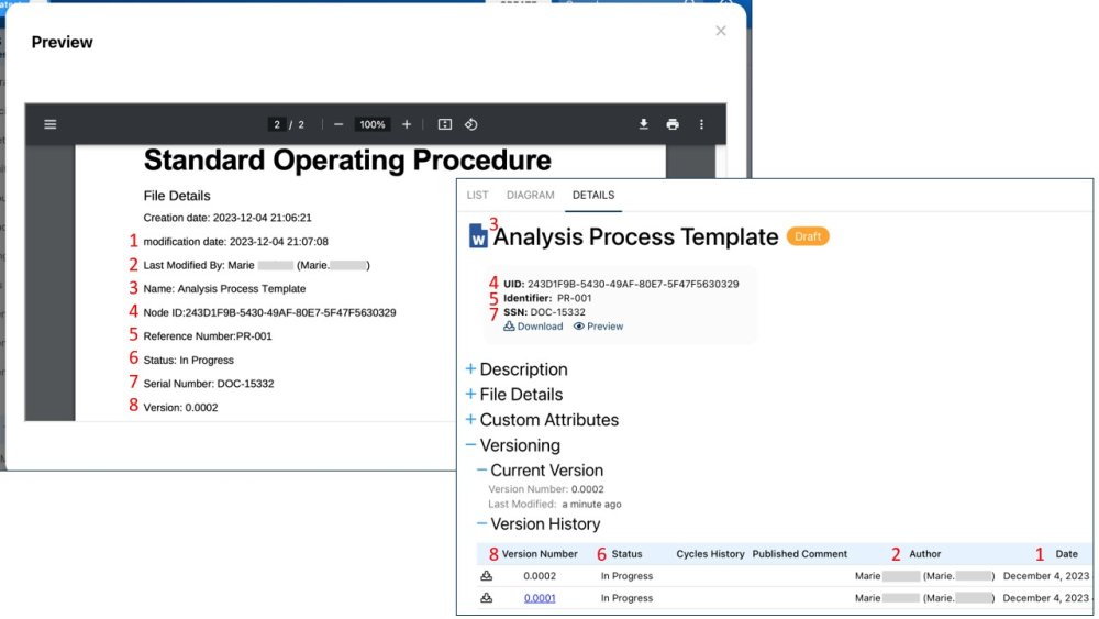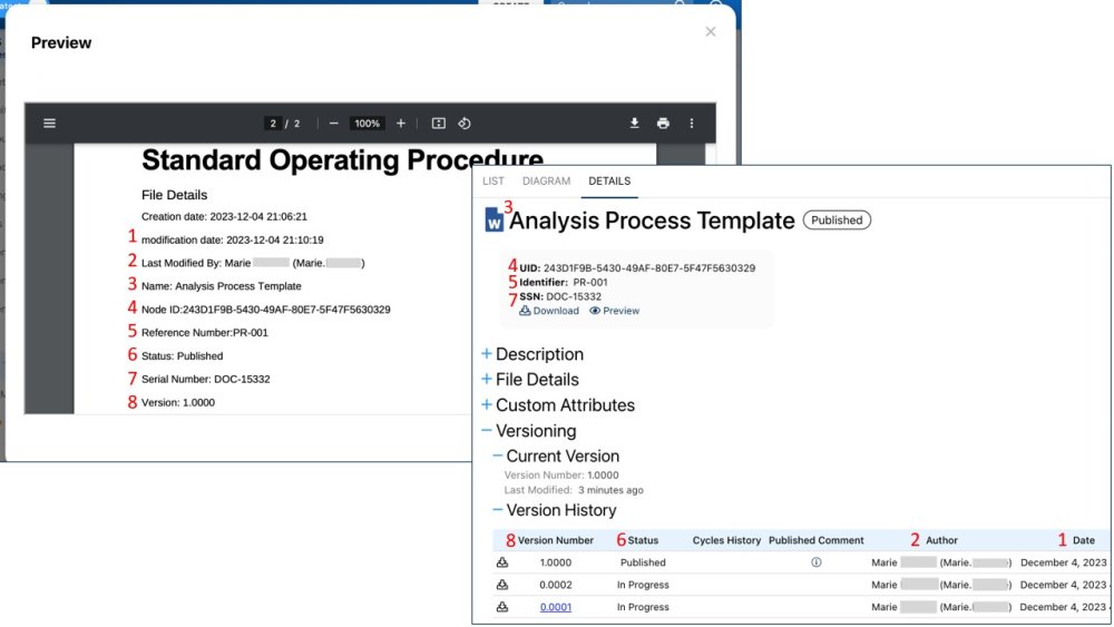 In the instance below, we began with the ‘Analysis Process Template’ document, which was in draft. After publishing, the custom properties are updated to reflect the changes. Pay special attention to the alterations of the modification date (1), the status (6), and the version number (8).